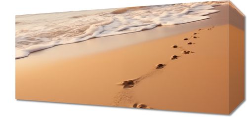 Obraz z serii pejzaże zatytułowany Szepty Fal przedstawia obraz, który zaprasza widza do kontemplacji i refleksji. Delikatne ślady stóp wskazują na cichą obecność, a przytłumione szumy fal i miękki piasek podkreślają uczucie spokoju. Rozmyte kolory zachodu słońca, które malują niebo na niemal nierzeczywiste odcienie pomarańczy i błękitu, wydają się być synonimem spokojnego zakończenia dnia. Ta praca idealnie wkomponuje się w estetykę współczesnych salonów lub pokoi wypoczynkowych, które cenią sobie minimalizm i naturę, a także będzie znakomitym wyborem dla przestrzeni wellness i spa, gdzie harmonia i spokój są kluczowymi elementami.
