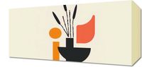 Obraz z serii boho zatytułowany Szeroka Czerń.Na obrazie widnieje ilustracja o abstrakcyjnym, geometrycznym stylu. Kompozycja składa się z szeregu prostych kształtów i bloków kolorów. Centralnym elementem jest czarny, szeroki wazon, z którego wyrasta bukiet stylizowanych, czarnych roślin. Obok wazonu znajduje się pionowy, pomarańczowy prostokąt i mniejsze kształty: koło w kolorze pomarańczowym i zaokrąglony kształt w odcieniu koralowym. Całość osadzona jest na jasnym tle, a kompozycja balansuje między prostotą formy a bogactwem wizualnym wynikającym z kontrastów i zróżnicowania kształtów.