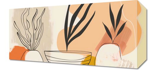 Obraz z serii boho zatytułowany Szkice Botaniczne. Na obrazie przedstawiono stylizowane rośliny o delikatnych, ale wyrazistych konturach w dwóch kontrastujących doniczkach, które stanowią centralny punkt kompozycji. Tło, składające się z abstrakcyjnych kształtów i pociągnięć pędzla w ciepłej palecie barw - od terrakoty do bladego koralu - zapewnia przyjemny kontrast dla czarnych linii roślin. Minimalistyczny charakter ilustracji, w połączeniu z organicznymi formami i neutralnymi barwami, sprawia, że jest to idealny element do wnętrz, które cenią prostotę i spokój, takich jak nowoczesne biura, jadalnie czy salony, gdzie może wprowadzić lekkość i świeżość wizualną.