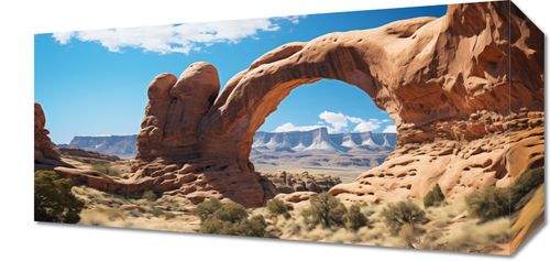 Obraz z serii pejzaże zatytułowany Triumf Natury. Zapierający dech w piersiach widok naturalnej formacji skalnej, która tworzy naturalny łuk, jest świadectwem niezwykłej siły i wytrwałości natury. Ciepłe odcienie pomarańczu i brązu skalnego łuku kontrastują z głębokim błękitem nieba, a delikatne zielone akcenty roślinności dodają życia i głębi kompozycji. Ta scena emanuje siłą i spokojem, stanowiąc doskonałe uzupełnienie dla przestrzeni takich jak współczesne biura, eleganckie pokoje dziennego wypoczynku, a także jako element dekoracyjny w hotelach i miejscach publicznych, gdzie natura spotyka się z designem.