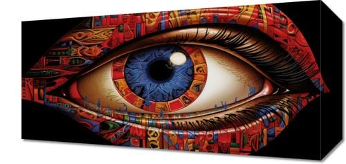 Obraz z serii abstrakcja zatytułowany W Oku Obserwatora. Ta złożona, surrealistyczna grafika przedstawia ludzkie oko, w którego tęczówce odzwierciedlone są bogate, abstrakcyjne i symboliczne wzory, przypominające fragmenty różnych dzieł sztuki. Barwne motywy w tęczówce mieszają się z intensywną czerwienią, żółcią i niebieskością, tworząc efekt kalejdoskopu kulturowych wpływów. Zadziwiająca szczegółowość pracy sugeruje głębię ludzkiego spojrzenia i różnorodność perspektyw, które możemy doświadczać poprzez sztukę. Obraz ten z pewnością zaintryguje i stanie się punktem centralnym każdej przestrzeni, szczególnie tam, gdzie sztuka i kreatywność są w cenie, jak studia artystyczne, galerie, czy nowoczesne salony.