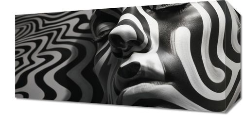 Obraz z serii abstrakcja zatytułowany Wtop Się We Mnie. Ten monochromatyczny obraz przedstawia zbliżenie na twarz kobiety, której skórę zdobią hipnotyzujące, czarno-białe wzory przypominające zebry. Skontrastowane linie zygzakowato przecinają płaszczyznę obrazu, tworząc złudzenie ruchu i głębi. Obraz jest przykładem wyrafinowanego połączenia sztuki portretowej z abstrakcyjnym designem, idealny do pomieszczeń o minimalistycznym lub nowoczesnym wnętrzu, takich jak galerie sztuki, nowoczesne biura, a także jako oryginalny akcent w domowym salonie. Jego unikalny styl przyciąga wzrok i zmusza do refleksji, stanowiąc idealny temat do rozmów w przestrzeniach społecznych.