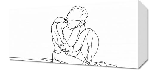 Obraz z serii wnętrza zatytułowany Zgarbienie. Obraz przedstawia minimalistyczny, jednoliniowy rysunek siedzącej postaci. Jest to przykład sztuki line art, gdzie cała forma jest zredukowana do jednej, ciągłej linii, która tworzy zarówno zewnętrzny kontur postaci, jak i wewnętrzne detale ciała i ubioru. Postać wydaje się zatopiona w myślach, z głową opartą na dłoni, co sugeruje introspekcję lub głębokie zamyślenie. Prosta elegancja tej pracy polega na jej zdolności do przekazywania emocji i postawy bez nadmiernego skomplikowania formy. Czyste tło podkreśla subtelność i skupienie kompozycji. Taki obraz może idealnie wpasować się w nowoczesne, ascetyczne wnętrza, gdzie może stanowić spokojny, ale wyrazisty akcent artystyczny.