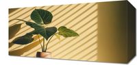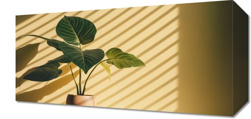Obraz z serii natura zatytułowany Złota Poświata. Urokliwa roślina doniczkowa o eleganckich, zielonych liściach z subtelnym żłobieniem, wypoczywająca w ciepłym świetle, które rzuca geometryczny wzór cieni na jasną ścianę. Minimalistyczna estetyka i gra światła nadają temu zdjęciu spokojną atmosferę, idealną do stworzenia oazy relaksu w domowych wnętrzach. Doskonale komponuje się z nowoczesnymi, jak i tradycyjnymi dekoracjami, dodając naturalnego akcentu do każdego pomieszczenia.