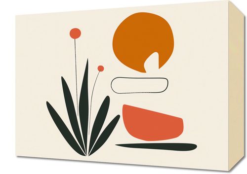 Obraz z serii boho zatytułowany Abstrakcyjny Zen. Kompozycja obrazu łączy prostotę z abstrakcją, przedstawiając zestaw harmonijnie zbalansowanych kształtów i form. Wyraźne, ciemnozielone liście tworzą bazę dla kompozycji, z której wyrastają dwa okrągłe kwiaty na cienkich łodygach. Ich delikatność jest dodatkowo podkreślona przez dużą, okrągłą formę w ciepłym pomarańczu i spokojny, kremowy tło. Obraz sprawia wrażenie spokojnego i medytacyjnego, co sprawia, że jest idealny do miejsc przeznaczonych na wyciszenie i relaks, takich jak jasne, przestronne salony, pokoje do medytacji czy minimalistyczne sypialnie.