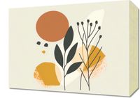 Obraz z serii boho zatytułowany Botaniczna Presja. Obraz prezentuje poetycką kompozycję botanicznych motywów i abstrakcyjnych form. Złapany w chwili spokoju bukiet delikatnych, ciemnozielonych gałązek z czarnymi owocostanami wznosi się dumnie na tle złocisto-pomarańczowych i beżowych kształtów, które mogą przypominać wschodzące słońce lub płatki kwiatów. Dyskretnie rozsiane mniejsze elementy, jak kropki w tonacji ziemi, nadają kompozycji lekkości i ruchu. Ta harmonijna gra kolorów i form wywołuje uczucie ciepła i natury, co czyni go idealnym dla przestrzeni, które mają na celu promowanie relaksu i odprężenia, jak salony, pokoje do jogi, czy też jadalnie, gdzie delikatne sztuki mogą inspirować spokojne rozmowy.