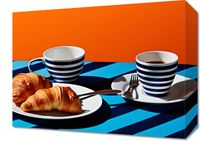Obraz z serii wnętrza zatytułowany Croissanty. Na grafice przedstawiono elegancką aranżację śniadaniową składającą się z parujących croissantów na talerzu, towarzyszących im filiżankach kawy. Kontrastujące, nasycone kolory - głęboka, błękitna i czarna prążkowana ceramika na tle żywego, pomarańczowego tła - przyciągają wzrok i budzą apetyt. Graficzne linie stołu w niebieskich i czarnych odcieniach dodają nowoczesności i stylu. Obraz ten doskonale nadaje się do wnętrz o wyrafinowanym smaku, takich jak kuchnie, jadalnie czy kawiarnie, celebrując rytuał porannej kawy i wypieków.