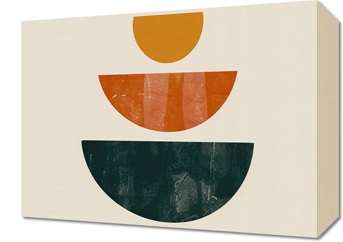 Obraz z serii boho zatytułowany Cykl Natury. Obraz przedstawia trzy przecinające się półkola, ułożone w pionowym szeregu, z których każde posiada unikalną fakturę i paletę barw - od spokojnego, złotego odcienia u góry, przez głęboką pomarańcz z akcentami ciepłej czerwieni pośrodku, do ciemnej, tajemniczej zieleni u dołu. Ta kompozycja wywołuje wrażenie harmonijnego przepływu czasu lub cykli natury. Świetnie sprawdzi się jako dekoracja w nowoczesnych przestrzeniach, takich jak minimalistyczne biura, salony w stylu skandynawskim, a także jako wyrafinowany akcent w strefach wypoczynkowych kawiarni lub butikowych hoteli.