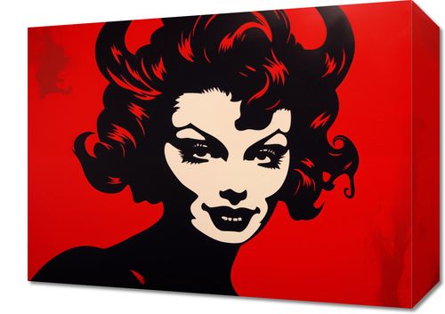 Obraz z serii pop art zatytułowany zatytułowany Czerwona Diablica. Na obrazie dominuje stylizowany portret kobiety w kontrastowych kolorach – głęboka czerń i intensywna czerwień tworzą silny wizualny kontrast, który przyciąga wzrok i intryguje. Wizerunek jest wyrazisty i graficzny, z mocnymi liniami i zredukowanym detalem, co nadaje mu nowoczesnego, prawie komiksowego charakteru. Kobieta jest przedstawiona z subtelnym uśmiechem i zmysłowym spojrzeniem, co nadaje jej tajemniczy i prowokujący charakter. Tło w jednolitym, żywym czerwonym kolorze podkreśla silną obecność postaci i jej niezaprzeczalny wpływ na otoczenie. Ten obraz jest hołdem dla klasycznej piękności i siły kobiecego wyrazu, idealnym dla przestrzeni, które pragną dodać odważnego stylu i charakteru.