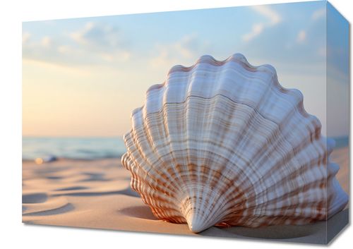 Obraz z serii natura zatytułowany Echo Morza. Delikatne, pastelowe barwy muszli występujące na pierwszym planie, z jej wyraźnymi liniami i subtelnym przejściem kolorów od kremowego do różowego, kontrastują z dynamicznym tłem zachodzącego słońca nad morzem. Złote refleksy światła na wodzie i miękki, piaskowy pierwszy plan tworzą poczucie głębi i spokoju. Idealny do wnętrz o tematyce morskiej, relaksacyjnych spa oraz jako element dekoracyjny w pokojach hotelowych z widokiem na morze.
