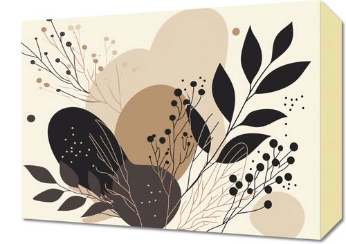 Obraz z serii minimalistyczne zatytułowany Harmonijka Przyrody. Ta grafika to estetyczna kompozycja abstrakcyjnych, organicznych kształtów i delikatnych motywów florystycznych w tonacji ziemi. Wykorzystanie różnych odcieni brązu, beżu oraz głębokiej czerni tworzy spokojną, ale i wyrafinowaną paletę barw. Kontrastowe, ciemne elementy florystyczne są pięknie zrównoważone przez jasne tło, nadając całości uczucie lekkości i elegancji.Jest to idealny wybór dla osób, które szukają subtelnego, ale wyrazistego elementu dekoracyjnego do swojego domu lub biura.