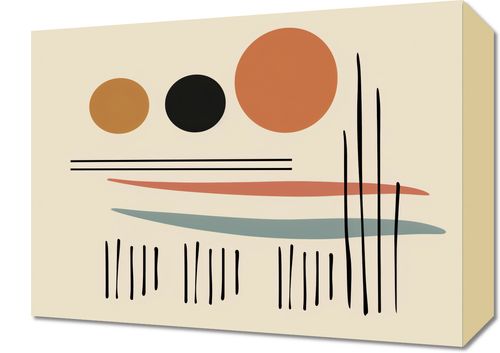 Obraz z serii boho zatytułowany Iluzja Horyzontu.Obraz to zestawienie geometrycznych kształtów i linii, które razem tworzą abstrakcyjny krajobraz. Okręgi w ciepłych odcieniach złota, pomarańcza i czerni sugerują wschodzące lub zachodzące słońce, a pionowe linie mogą przypominać wysokie trawy lub cienie drzew. Poziome pasy w różnych kolorach tworzą iluzję horyzontu, nadając kompozycji głębi i równowagi. Dzieło to wprowadzi do każdego wnętrza element spokoju i kontemplacji. Jest idealne dla przestrzeni, które cenią prostotę i abstrakcję, takich jak nowoczesne salony, minimalistyczne przestrzenie robocze, czy jako element dekoracyjny w pomieszczeniach oczekujących.