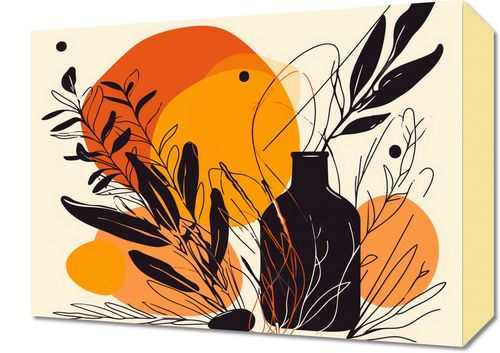 Obraz z serii minimalistyczne zatytułowany Jaskrawy Zachód. Na grafice widnieje silnie stylizowany motyw roślinny, gdzie czarne sylwetki roślin kontrastują z jaskrawo pomarańczowym i żółtym tłem, przypominającym zachodzące słońce. W tle pojawiają się delikatne, abstrakcyjne linie i kształty, dodające kompozycji głębi i tekstury.Ten plakat doskonale wpasuje się w wnętrza ożywione roślinnością, zarówno te domowe, jak i komercyjne przestrzenie typu kawiarnie lub sklepy z roślinami. Jego ciepłe barwy będą wprowadzać przytulną atmosferę i mogą stanowić żywy akcent w przestrzeniach utrzymanych w naturalnej kolorystyce.