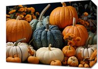 Obraz z serii natura zatytułowany Jesienne Urodzaje przedstawia bujne bogactwo jesieni. Centralne miejsce zajmuje soczysta, pomarańczowa dynia, królowa jesieni, otoczona przez różnorodność jej barwnych odmian. Niebieskawe i białe dynie tworzą wyjątkowy kontrast, a wszystko to uzupełnione jest przez złociste i burgundowe chryzantemy, które dodają kompozycji ciepła i głębi. Całość osadzona jest na tle w klasycznych, ciemnych odcieniach, co podkreśla elegancję i dojrzałość sezonu. Obraz ten idealnie wpasuje się w przestrzeń kuchni lub jadalni, dodając jej charakteru oraz ciepłego, domowego klimatu. Doskonale odnajdzie się także w przestrzeniach takich jak winiarnie czy restauracje serwujące sezonowe dania, gdzie podkreśli bogactwo i obfitość jesiennej palety smaków.
