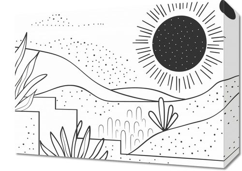 Obraz z serii minimalistyczne zatytułowany Linearny Pejzaż. Obraz przedstawia liniową ilustrację krajobrazu w czerni i bieli, gdzie przestrzeń zapełniają delikatne linie, kropki i abstrakcyjne formy roślinności. Centralnym punktem jest stylizowane słońce z promieniami rozchodzącymi się we wszystkie strony, towarzyszy mu mniejsze ciało niebieskie, które może symbolizować planetę lub księżyc. Lekkie kropki sugerują obecność piasku lub gwiazd, dodając elementu fantazji. Ten obraz wprowadzi do każdej przestrzeni element spokoju i prostoty. Idealnie nadaje się do nowoczesnych przestrzeni, takich jak minimalistyczne biura, jadalnie czy pokoje młodzieżowe, dostarczając neutralnej palety, która pasuje do wielu schematów kolorystycznych i stylów dekoracyjnych.