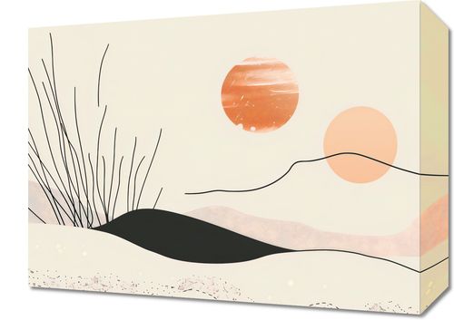 Obraz z serii boho zatytułowany Miękkie Wzgórze. Przedstawia on poetycką interpretację zachodzącego słońca, gdzie delikatne linie roślin wyłaniają się z miękkich, falujących wzgórz. Paleta kolorów to ciepłe odcienie beżu, różu oraz akcenty silniejszego pomarańczu i głębokiej czerni, które razem tworzą kojącą i spokojną atmosferę. Abstrakcyjne słońca o różnych odcieniach i wielkościach dodają kompozycji głębi i perspektywy. Ten obraz doskonale sprawdzi się jako akcent dekoracyjny w przestrzeniach, które mają być miejscem relaksu i odprężenia. Jego spokojna kolorystyka i delikatne linie będą komplementować wnętrza takie jak sypialnie, pokoje medytacyjne, gabinety relaksacyjne lub każde miejsce, które chce celebrować spokój i cichą elegancję.