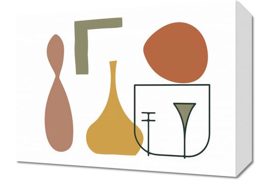 Obraz z serii boho zatytułowany Naczynia. Obraz prezentuje kolekcję abstrakcyjnych form, które przypominają różne przedmioty od naczyń po elementy dekoracyjne, tworząc estetyczną mieszankę linii i kształtów. Zestawienie spokojnych, pastelowych barw z silnymi, geometrycznymi figurami tworzy wizualnie przyjemną kompozycję, która zwraca uwagę swoją subtelną elegancją. To dzieło artystyczne jest doskonałym wyborem dla wnętrz o nowoczesnym designie, w których chcemy wprowadzić sztukę bez dominujących nad przestrzenią. Idealnie sprawdzi się jako delikatny akcent w przestronnym salonie, biurze czy jako część galerii w domowym korytarzu.