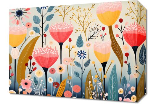 Obraz z serii abstrakcja zatytułowany Ogród Marzeń to urokliwa kompozycja, która przyciąga wzrok żywą paletą barw i abstrakcyjnym przedstawieniem natury. Każda kwiatowa forma jest tu celebracją różnorodności i piękna, od wyrafinowanych, wysmukłych pędów po pełne uroku, rozłożyste płatki. Subtelne detale, takie jak kropki na liściach czy delikatne linie na płatkach, dodają dziełu głębi i tekstury. Ta bujna, kwitnąca łąka jest wizją natury, która przenosi widza w świat fantazji i spokoju. Idealnie sprawdzi się jako centralny punkt w nowoczesnych przestrzeniach mieszkalnych, w pokojach relaksu, a także w przestrzeniach komercyjnych, takich jak spa, salony piękności lub poczekalnie, gdzie wprowadzi atmosferę spokoju i harmonii.