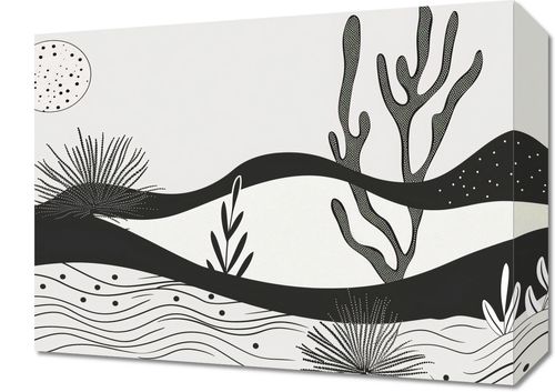 Obraz z serii minimalistyczne zatytułowany Ogród przy Nocy. Obraz ukazuje graficzną kompozycję roślin i kształtów inspirowanych nocnym ogrodem. Centralnym elementem jest białe, teksturalne słońce na tle ciemnych, falujących wzgórz i plam. Rośliny są przedstawione w stylu graficznym z użyciem kropek i linii, co nadaje ilustracji delikatności i artystycznego charakteru. Całość utrzymana jest w czerni i bieli z akcentami, co sprawia, że jest zarówno nowoczesna, jak i ponadczasowa. Obraz ten idealnie wpasuje się w przestrzenie, które cenią sobie minimalistyczny design z nutą tajemniczości. Będzie pięknym dodatkiem do wnętrz, takich jak nowoczesne salony, sypialnie czy biura, wprowadzając element spokoju i wyrafinowanej estetyki.
