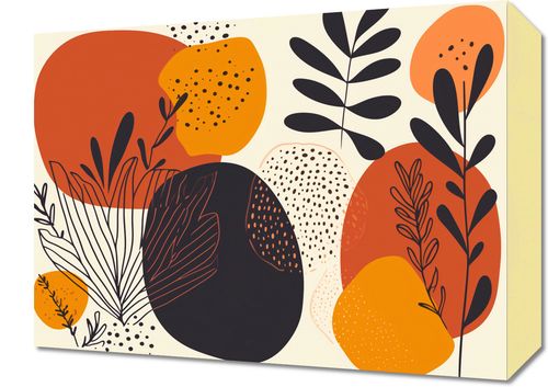 Obraz z serii minimalistyczne zatytułowany Ogród Wspomnień. Grafika ta łączy w sobie bogactwo organicznych kształtów i roślinnych motywów z paletą ciepłych barw takich jak terakota, musztarda i czerni, tworząc wizualną opowieść pełną spokoju i nostalgi.Ten obraz doskonale nada się do przestrzeni, które celebrują naturę i spokój, takich jak salony, pokoje do medytacji lub ciche zakątki bibliotek.