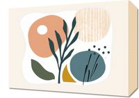 Obraz z serii boho zatytułowany Pastel Owoców.Obraz przedstawia stilizowany obraz natury, gdzie organiczne formy i kształty łączą się w nieoczywisty sposób. W kompozycji dominuje duża, pastelowa forma przypominająca owoce lub słońce, która kontrastuje z subtelnym tłem w delikatnych odcieniach beżu ozdobionym wertykalnymi liniami. Obok widnieją płynne, ciemnozielone liście oraz zaokrąglone, geometryczne formy w odcieniach szarości i musztardy, uzupełnione o subtelne graficzne akcenty. Obraz będzie pięknie komponował się w przestrzeniach poszukujących elementów natury w abstrakcyjnej, uproszczonej formie, idealnie nadając się do nowoczesnych salonów, kreatywnych przestrzeni pracy lub jako delikatny akcent w minimalistycznej sypialni.