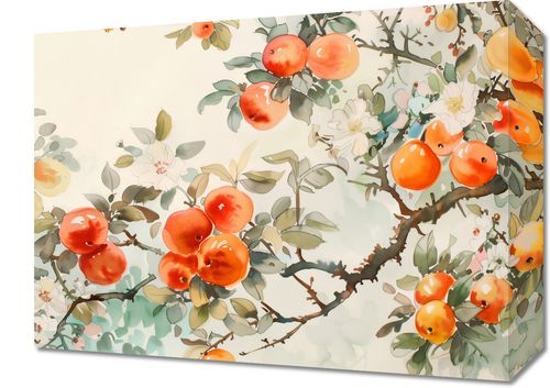 Obraz z serii abstrakcja zatytułowany Persymony. Przedstawia delikatną i kolorową ilustrację gałęzi owocowych w stylu azjatyckiej akwareli. Na obrazie widzimy rozkwitające kwiaty oraz dojrzałe, soczyste owoce persymony których intensywna pomarańczowa barwa jest pięknie wyeksponowana na tle pastelowych kolorów. Liście i gałęzie są przedstawione z subtelnymi niuansami zieleni i brązów, co dodaje głębi i naturalnego charakteru scenie. Ta sztuka łączy w sobie tradycyjne motywy i techniki malarskie z nowoczesnym podejściem do koloru i kompozycji, co czyni ją zarówno klasyczną, jak i współczesną. Obraz ten idealnie nadawałby się do przestrzeni, które cenią spokój i harmonię, takich jak salony relaksacyjne, gabinety spa, czy jako wyrafinowany akcent w domowej jadalni.