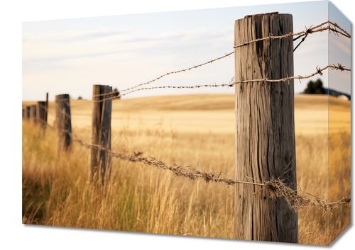 Obraz z serii pejzaże zatytułowany Płot na Polu. Obraz przedstawia rustykalny drewniany płot z drutem kolczastym, ciągnący się wzdłuż złocistego, zbożowego pola. Delikatne odcienie złota i brązu, w połączeniu z subtelnie rozmytym tłem, tworzą poczucie głębi i przestrzeni. Ten spokojny, wiejski krajobraz wprowadza atmosferę relaksu i odprężenia, idealnie nadając się do wnętrz inspirowanych naturą lub jako ukojenie dla zaganianych mieszkańców miast. Doskonały do salonu, jadalni lub jako element wypoczynkowej przestrzeni.