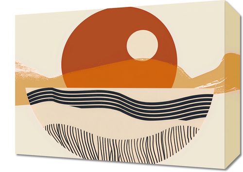 Obraz z serii boho zatytułowany Pół na Całość. Obraz przedstawia uproszczony, geometryczny krajobraz, w którym słońce jest głównym bohaterem, stanowiąc centralny punkt kompozycji. Jego okrągły kształt dominuje na tle abstrakcyjnych wzgórz i falujących linii, które mogą przypominać wzburzone morze lub piaszczyste wydmy. Kolorystyka plakatu to spokojna paleta ciepłych odcieni pomarańczu, beżu i czerni, która nadaje dziełu głębi i kontrastu.Ten obraz będzie wspaniałym dodatkiem do wnętrz urządzonych w ciepłych, ziemistych barwach, gdzie może dodać nowoczesnego charakteru. Idealnie sprawdzi się jako punkt centralny w przestrzeniach, które korzystają z naturalnego światła, takich jak salony, gabinety czy przestronne hole.