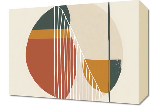 Obraz z serii boho zatytułowany Półbłysk. Obraz przedstawia abstrakcyjne, geometryczne formy w ciepłej, ziemistej palecie barw. W centrum kompozycji widnieje duży, półprzezroczysty krąg, w którym mieszają się bloki kolorów: od głębokiej zieleni, poprzez terakotę, po musztardowy i kremowy. Przez środek tego kręgu biegną pionowe, białe linie, które dodają kompozycji głębi i rytmu, tworząc efekt przestrzenności. Z prawej strony obrazu, cienka, czarna linia tworzy swego rodzaju kontrapunkt dla zaokrąglonych form. Ten obraz idealnie odnajdzie się w nowoczesnych przestrzeniach, gdzie dominują proste formy i stonowane barwy. Jego spokojna paleta kolorów i czyste linie będą doskonałym tłem dla minimalistycznych biur, eleganckich salonów czy designerskich poczekalni. Dzieło to może również służyć jako subtelny akcent w przestrzeniach, gdzie dominują naturalne materiały i stonowana kolorystyka.