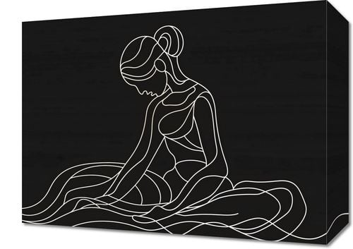 Obraz z serii wnętrza zatytułowany Pozycja Siedząca. Przedstawia minimalistyczny, linearny rysunek kobiety w pozycji siedzącej, wykonany białą linią na ciemnym tle. Praca artystyczna charakteryzuje się prostotą i elegancją, z postacią zredukowaną do serii płynnych, ciągłych linii, które tworzą zarówno kontury zewnętrzne, jak i subtelne detale ciała i stroju. Delikatny gęstwin linii w dolnej części obrazu sugeruje fałdy tkaniny, dodając wrażenia głębi i miękkości do kompozycji. Postać kobiety, z głową lekko pochyloną w dół, wyraża spokój i kontemplację. Obraz ten, z jego czystymi liniami i zrelaksowanym motywem, może wprowadzić atmosferę spokoju i wyciszenia do każdego nowoczesnego wnętrza, nadając mu jednocześnie artystycznego charakteru.