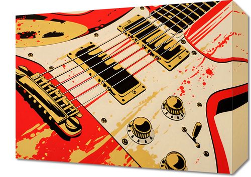 Obraz z serii abstrakcja zatytułowany Przed Graniem. Przedstawia zbliżenie na czerwoną gitarę elektryczną, której design jest wyrazisty i pełen energii. Widać detale instrumentu, takie jak przetworniki, potencjometry i struny, które są wyraźnie zaznaczone kontrastującymi kolorami złota, czerni i bieli na tle intensywnej czerwieni. Rozpryski i plamy farby na korpusie gitary nadają plakatowi surowy, rockowy charakter, co może sugerować żywiołowość i pasję muzyki granej na tym instrumencie. Ten obraz mógłby być atrakcyjnym elementem dekoracyjnym w przestrzeniach dedykowanych muzyce, takich jak sale prób, studia nagraniowe, pokoje młodzieżowe lub jako odważny akcent w nowoczesnym salonie.