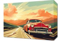Obraz z serii pop art zatytułowany Przygoda Czeka. Ilustracja przedstawia klasyczny czerwony samochód z lat 50-tych, który wyrusza w podróż wzdłuż malowniczej, pustej drogi prowadzącej ku zachodzącemu słońcu. Dramatyczne chmury i rozświetlone niebo tworzą tło dla tego zapierającego dech w piersiach krajobrazu. Sceneria jest nasączona barwami zachodu słońca, od ciepłych żółci po głębokie pomarańcze, tworząc poczucie przygody i niekończących się możliwości. Obraz ten doskonale sprawdzi się w stylowym salonie, biurze, a nawet w garażu entuzjasty klasycznych samochodów, inspirując do marzeń o podróży i odkrywaniu nowych miejsc.