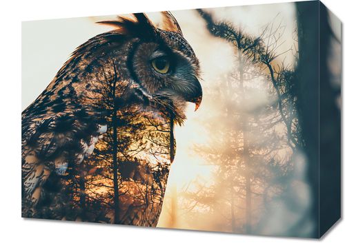 Obraz z serii natura zatytułowany Sowi Duch. Prezentuje on majestatyczną sylwetkę sowy zlewaną z tłem o zachodzie słońca w lesie, co podkreśla jej dziką naturę i instynktowną mądrość. Ciepłe odcienie zachodzącego słońca i sylwetki drzew przenikają się z delikatnym konturem sowy, tworząc wrażenie jedności z naturą. Obraz ten idealnie wpasuje się w przestrzenie takie jak gabinet, biblioteka lub salon, gdzie może inspirować do refleksji i spokoju, przypominając o głębokich, nieodkrytych aspektach natury.