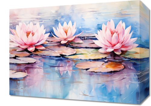 Obraz z serii natura zatytułowany Spokojne Odbicia, przedstawia trzy kwiaty lotosu unoszące się na spokojnej powierzchni wody, otoczone przez subtelnie odbijające się lilie wodne. Styl obrazu, który z jego delikatnymi, acz wyrazistymi pociągnięciami przypomina akwarelę, tworzy uczucie spokoju i medytacyjnej głębi. Pastelowa paleta barw, z dominującymi odcieniami różu i błękitu, przekazuje uczucie delikatności i spokoju. Kwiaty lotosu, symbolizujące czystość i oświecenie w wielu kulturach, są tu przedstawione w sposób, który podkreśla ich piękno i symboliczną siłę. Ten obraz idealnie odnajdzie się w przestrzeniach, które aspirują do stworzenia atmosfery spokoju i wewnętrznej harmonii, takich jak salony spa, centra medytacyjne, jadalnie, a także jako element wzbogacający wnętrza mieszkalne, zachęcając do refleksji i wyciszenia.