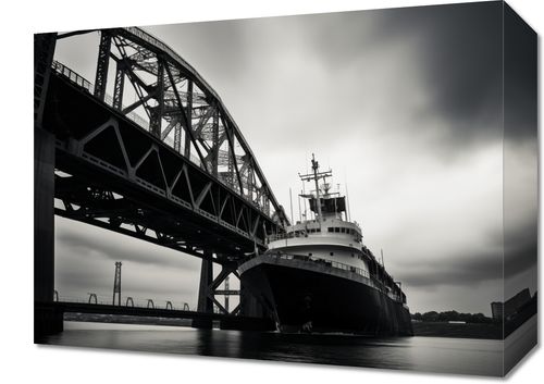 Obraz z serii pejzaże zatytułowany Statek przy Moście. Monochromatyczne przedstawienie statku pod imponującym mostem, gdzie struktury inżynieryjne łączą się z dynamicznym niebem, tworząc kompozycję symbolizującą siłę i postęp. Chłodna paleta barw i silne linie prowadzące oko przez obraz idealnie nadają się do nowoczesnych przestrzeni biurowych lub urbanistycznych salonów. Obraz ten przyciąga uwagę i inspiruje, odzwierciedlając majestat i piękno konstrukcji stworzonych przez człowieka.