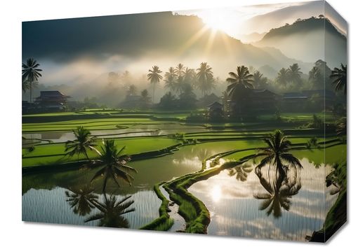 Obraz z serii pejzaże zatytułowany Świt nad Tarasami. Ta zachwycająca scena przedstawia malownicze tarasy ryżowe, kąpane w ciepłym świetle wschodzącego słońca. Mgła delikatnie opada na zielone pola, a w tle majaczą zarysy gór, dodając głębi i tajemniczości krajobrazowi. Palmy i tradycyjne chaty dopełniają obrazu, tworząc wizję spokoju i harmonii z naturą. Obraz emanuje spokojem i jest hołdem dla prostoty wiejskiego życia. Idealnie wkomponuje się w przestrzenie, gdzie chcemy wprowadzić element uspokajający i zainspirowany naturą, jak medytacyjne spa, poczekalnie w klinikach wellness czy prywatne biblioteki.