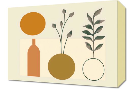 Obraz z serii boho zatytułowany Symfonia Równowagi. Obraz łączy organiczne kształty roślin z rygorystyczną formą geometrii. Prezentuje on wazony w spokojnych odcieniach brązu i złota, z których jeden jest ozdobiony gałązkami z delikatnymi pąkami, a drugi pokazuje symetryczny wzór liści. Proste linie i figury geometryczne, takie jak okrąg i prostokąt, tworzą tło dla roślinności, przypominając o ludzkiej próbie ujarzmienia natury. Całość osadzona na pastelowym tle wywołuje uczucie spokoju i harmonii. To dzieło będzie pasowało do przestrzeni, które cenią równowagę między naturą a stworzonym przez człowieka porządkiem, jak eleganckie gabinety, przestrzenie wellness lub strefy odpoczynku, które dążą do stworzenia oazy spokoju w zabieganym świecie.