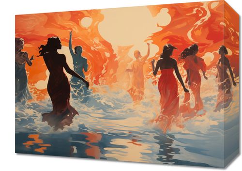 Obraz z serii wnętrza zatytułowany Taneczny Żar, przedstawia grupę osób tańczących w rytmicznych ruchach w wodzie, z tłem zapalającego się nieba w odcieniach ciepłego pomarańczu i czerwieni. Postacie są przedstawione w dynamicznych pozach, z włosami rozwianymi przez wiatr, co nadaje obrazowi wrażenie ruchu i pasji. Styl obrazu, z jego płynnymi liniami i żywymi kolorami, tworzy uczucie energii i życia. Ten obraz idealnie nadaje się do wnętrz, które chcą uchwycić esencję ruchu, radości i wolności, takich jak studia taneczne, kreatywne przestrzenie pracy, a także jako inspirujący element w domach, gdzie może stanowić przypomnienie o pięknie wspólnych chwil i celebracji życia.