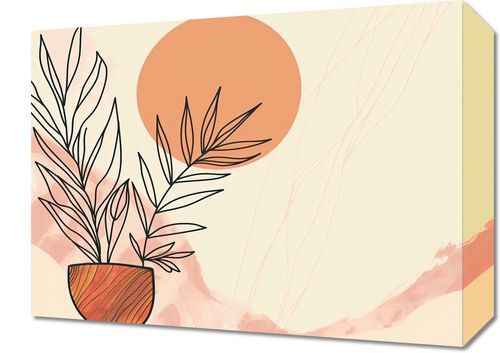 Obraz z serii minimalistyczne zatytułowany Widok nad Pustynią. Obraz przedstawia prostą, lecz wyrazistą kompozycję rośliny w glinianym doniczce na tle stylizowanego, pastelowego krajobrazu pustynnego. Wzgórza pustyni w odcieniach beżu i pomarańczu tworzą miękkie, falujące linie, nad którymi wznosi się duży, okrągły dysk słońca o intensywnej, ciepłej barwie. Delikatne linie, które wydają się emanować od słońca, przypominają ciepłe wiatry pustyni lub subtelne promienie słoneczne. Obraz ten wydaje się być idealny do ożywienia i dodania ciepła każdej przestrzeni, szczególnie tych, które są utrzymane w jasnej i neutralnej kolorystyce. Jego delikatna paleta i klarowność form mogą wprowadzić atmosferę spokoju i równowagi do salonów, jadalni czy nawet nowoczesnych przestrzeni biurowych.