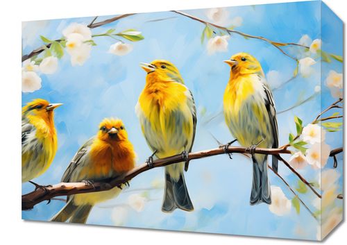 Obraz z serii natura zatytułowany Wiosenne Pogwizdy - malowniczy portret czterech zięb na gałęzi w otoczeniu delikatnych, białych kwiatów, z tłem w odcieniach błękitu przypominających wiosenne niebo. Złociste i żółte barwy ptaków wspaniale kontrastują z pastelowymi akcentami otoczenia, tworząc obraz pełen życia i świeżości. Wyraźne pociągnięcia pędzla i żywa paleta barw nadają dziełu dynamiki, jednocześnie zachowując łagodny charakter. To doskonały wybór dla przestrzeni, które mają odzwierciedlać optymizm i nowe początki, idealny do salonów, poczekalni lub jako element dekoracyjny w przychodniach.