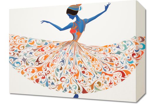 Obraz z serii abstrakcja zatytułowany Wirująca Balerina. Obraz przedstawia tancerkę w barwnym, rozłożystym stroju, który tworzy efekt wirującej sukni. Tancerka jest przedstawiona w dynamicznej pozie tanecznej, z rękami delikatnie uniesionymi. Suknia jest zdobiona bogatym, ornamentowym wzorem w ciepłych odcieniach pomarańczy, czerwieni, niebieskiego i kremu, które nadają jej lekkości i elegancji. Stylizacja postaci i wzory na sukni mogą nawiązywać do tradycyjnych strojów tanecznych lub folklorystycznych, a cała kompozycja przypomina sztukę w stylu Art Nouveau. Obraz ten wprowadza atmosferę radości i świętowania, doskonale nadając się do przestrzeni kulturalnych, sal tanecznych, teatrów lub jako wyrafinowana dekoracja w domowych wnętrzach.
