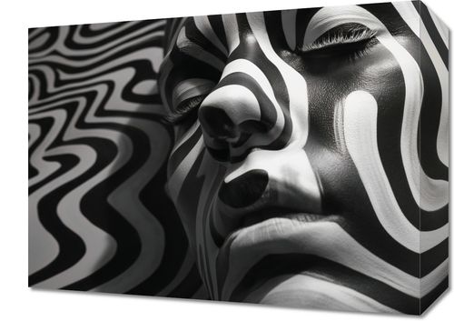 Obraz z serii abstrakcja zatytułowany Wtop Się We Mnie. Ten monochromatyczny obraz przedstawia zbliżenie na twarz kobiety, której skórę zdobią hipnotyzujące, czarno-białe wzory przypominające zebry. Skontrastowane linie zygzakowato przecinają płaszczyznę obrazu, tworząc złudzenie ruchu i głębi. Obraz jest przykładem wyrafinowanego połączenia sztuki portretowej z abstrakcyjnym designem, idealny do pomieszczeń o minimalistycznym lub nowoczesnym wnętrzu, takich jak galerie sztuki, nowoczesne biura, a także jako oryginalny akcent w domowym salonie. Jego unikalny styl przyciąga wzrok i zmusza do refleksji, stanowiąc idealny temat do rozmów w przestrzeniach społecznych.