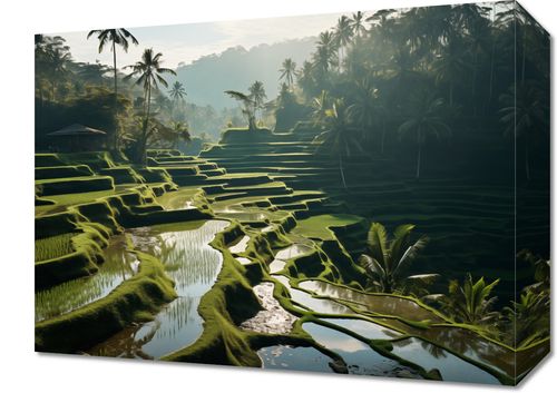 Obraz z serii pejzaże zatytułowany Zielone Sanktuarium. Sceneria prezentuje idylliczne tarasy ryżowe otoczone przez soczyste zieleń drzew palmowych i subtelną mgłę poranną. Delikatne światło słońca przebija się przez listowie, rzucając tajemnicze cienie i podkreślając wielowymiarowość krajobrazu. Harmonia kolorów i światła zachęca do refleksji i wyciszenia. Idealnie uzupełni przestrzeń domową, stając się oazą spokoju, jak również znajdzie swoje miejsce w przestrzeniach biznesowych, takich jak spa czy gabinety relaksacyjne, gdzie natura jest częścią terapii.