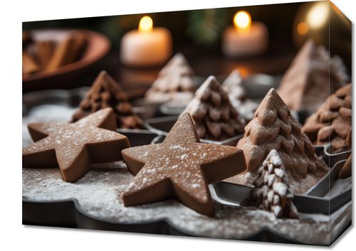 Obraz z serii święta zatytułowany Zimowa Przyprawa, to obraz, który przenosi widza do serca domowego ciepła podczas świątecznego sezonu. Kompozycja przedstawia piernikowe gwiazdy i choinki posypane śnieżnobiałym cukrem pudrem, ułożone obok migoczących świece, które dodają scenie ciepłego blasku. W tle, ciemne, bogate kolory i subtelną głębię sceny zapewniają aromatyczne przyprawy jak cynamon i anyż. Ten plakat to kwintesencja świątecznej atmosfery, idealny do zawieszenia w kuchni lub jadalni, przynosząc nutę świątecznej radości i spokoju do każdego domu. Idealnie sprawdzi się także jako dekoracja w kawiarniach lub restauracjach, które chcą podkreślić swoją świąteczną ofertę.