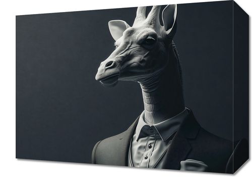 Obraz z serii pop art zatytułowany Żyrafa na Wyjściu. Przedstawia on surrealistyczny portret żyrafy ubranej w klasyczny garnitur, który jest kwintesencją połączenia dzikości natury z ludzką formalnością. Mieniąca się gra światłocienia na twarzy żyrafy dodaje portretowi głębi i tajemniczości, podczas gdy starannie dopasowany garnitur podkreśla nietypową prezencję postaci. Neutralne tło pozwala na pełne skupienie na centralnej postaci, a monochromatyczna paleta barw uwypukla detale i tekstury. Ten obraz idealnie sprawdzi się jako odważny akcent w nowoczesnych biurach, przestrzeniach kreatywnych, czy nawet w domowym gabinecie, wprowadzając element dyskusji i refleksji na temat konwencji i indywidualności.