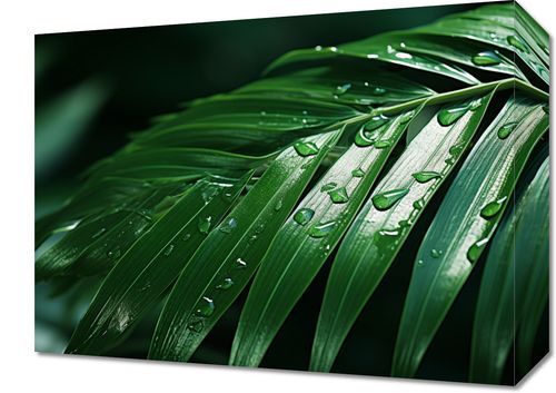 Obraz z serii natura zatytułowany Żywa Łagodność, przedstawia szczegółowe zbliżenie na liście palmy w odcieniach żywej zieleni, oświetlone promieniami słońca przenikającymi przez ich szpary. Gładkie i lśniące liście, z delikatnymi kroplami wody na ich powierzchni, tworzą poczucie ruchu i dynamiki, podczas gdy ich kontrastujące linie i formy wnoszą element struktury i elegancji. Delikatne światło i cienie na liściach, w połączeniu z bogatą paletą zieleni, wywołują uczucie spokoju oraz bliskości z naturą. Ta fotograficzna kompozycja mogłaby doskonale uzupełnić wnętrza, które cenią naturalność i organiczną estetykę, takie jak eko-salon, przestrzeń do jogi lub biura koncentrujące się na zrównoważonym rozwoju i ekologicznych inicjatywach.