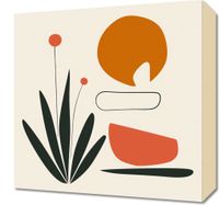 Obraz z serii boho zatytułowany Abstrakcyjny Zen. Kompozycja obrazu łączy prostotę z abstrakcją, przedstawiając zestaw harmonijnie zbalansowanych kształtów i form. Wyraźne, ciemnozielone liście tworzą bazę dla kompozycji, z której wyrastają dwa okrągłe kwiaty na cienkich łodygach. Ich delikatność jest dodatkowo podkreślona przez dużą, okrągłą formę w ciepłym pomarańczu i spokojny, kremowy tło. Obraz sprawia wrażenie spokojnego i medytacyjnego, co sprawia, że jest idealny do miejsc przeznaczonych na wyciszenie i relaks, takich jak jasne, przestronne salony, pokoje do medytacji czy minimalistyczne sypialnie.