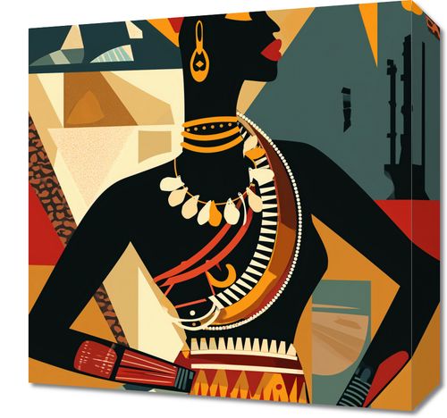 Obraz z serii abstrakcja zatytułowany Afrykańska Mozaika. Prezentuje on stylizowany profil afrykańskiej kobiety, ubranej w tradycyjne ozdoby i hełm, który jest równie bogaty w kulturę, co w estetykę. Tło i postać są zbudowane z geometrycznych kształtów i ciepłych, ziemistych kolorów, które oddają bogactwo i różnorodność afrykańskiego dziedzictwa. Złote i czerwone akcenty na postaci kontrastują z spokojnymi odcieniami tła, co podkreśla jej wyjątkowy charakter. Obraz ten będzie doskonałym dodatkiem do wnętrz, które chcą uczcić i wyeksponować bogactwo kulturowe, takich jak salony, przestrzenie społecznościowe czy miejsca o tematyce edukacyjnej i kulturalnej.