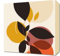 Obraz z serii minimalistyczne zatytułowany Brzask Złota.Ta grafika cechuje się prostotą form i bogactwem barw. Kontrastujące kształty liści na tle stonowanych kół tworzą harmonijną całość, która może być interpretowana jako metafora równowagi w przyrodzie. Ciepłe kolory żółci i pomarańczy przenikają się z głębokimi odcieniami brązu, co może sugerować zmianę sezonów lub cykl życia. Stylizacja ta przypomina o spokojnym, lecz żywym rytmie natury i mogłaby doskonale wpasować się w przestrzeń domową jako element dekoracyjny, niosący ze sobą spokój i refleksyjność.
