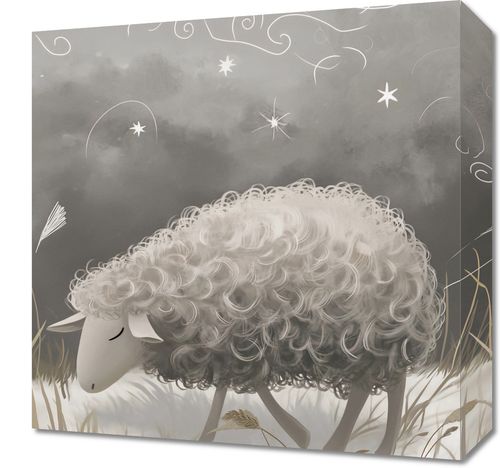 Obraz z serii wnętrza zatytułowany Bujna Owca. Ukazuje on idylliczny obraz owcy o bujnej, puszystej wełnie wśród delikatnej roślinności, z mistycznymi, snującymi się liniami i gwiazdami w tle, tworzącymi atmosferę spokoju i magii. Monochromatyczna paleta barw, z akcentami bieli i szarości, wzmaga uczucie łagodności i odprężenia. Całość kompozycji jest subtelnym przypomnieniem o potrzebie odpoczynku i harmonii z naturą. Obraz ten idealnie nadaje się do przestrzeni zapewniających spokój, takich jak sypialnie, pokoje dla dzieci, miejsca medytacji lub terapeutyczne przestrzenie relaksacyjne. Wprowadzi on do każdego wnętrza element wyciszenia i zachęci do chwil refleksji i spokoju.